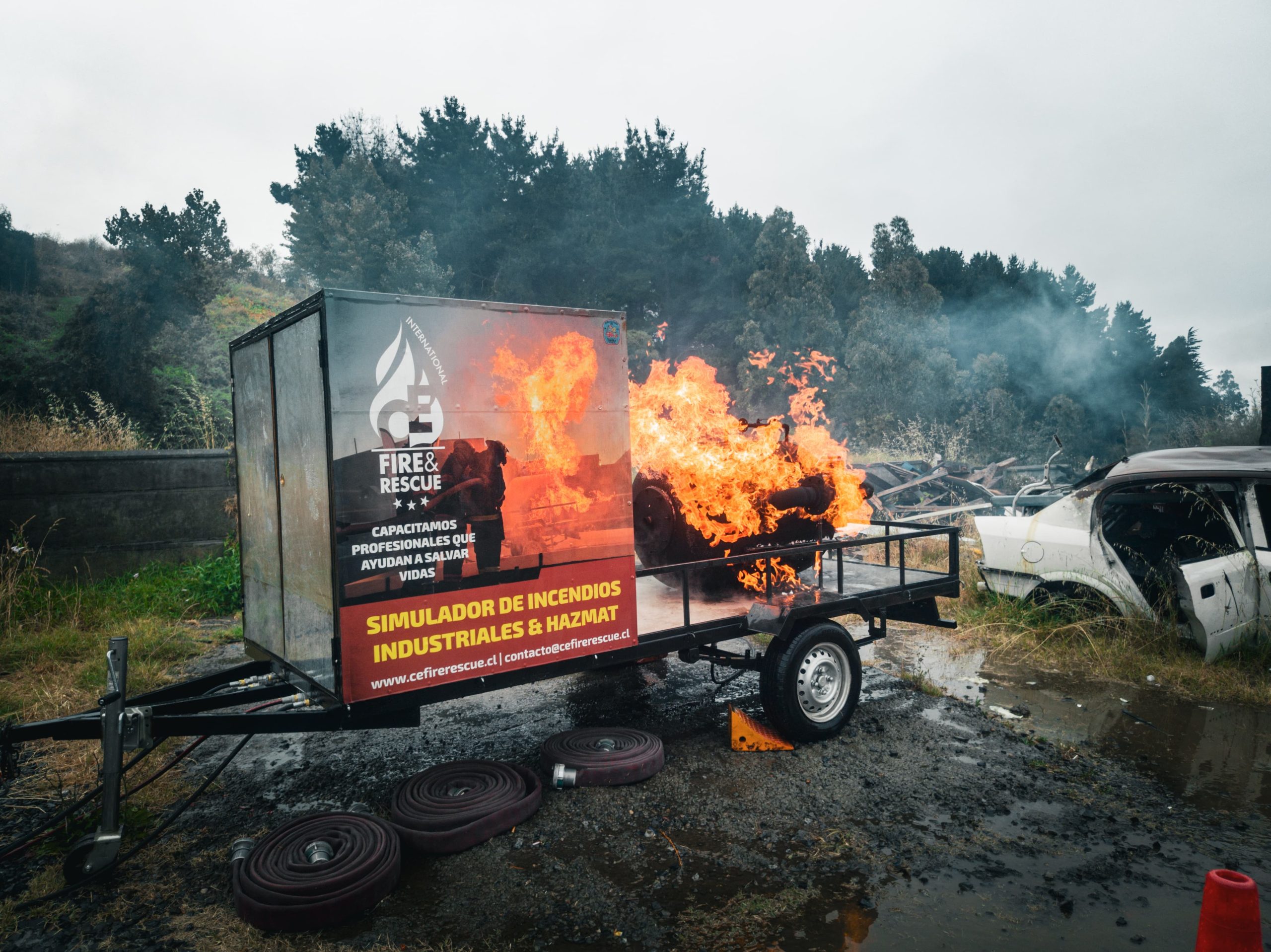 Nuestro sistema, montado sobre carro de arrastre autónomo, permite generar fuego real controlado y fugas presurizadas, replicando escenarios críticos asociados a instalaciones industriales con gases licuados de petróleo.